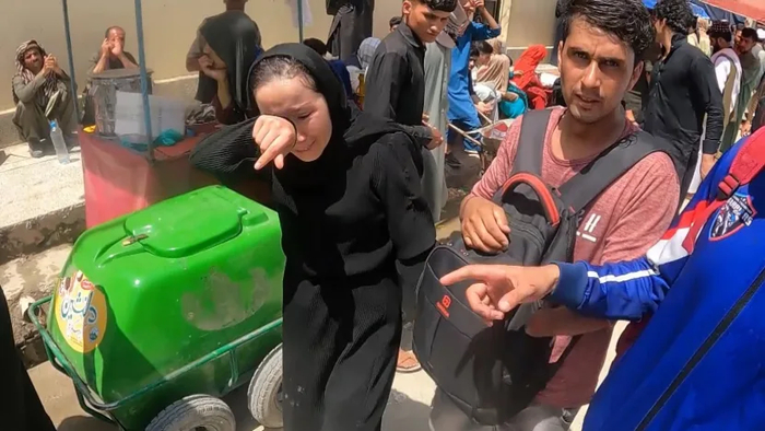 8月22日下午,扎齐亚和侯赛因在喀布尔机场外和阿富汗残奥委会的官员们走散,无法进入机场。她已经筋疲力尽,在机场的墙外边走边哭,几乎失去了信心。在一张现场照片里,扎齐亚抱着她的粉色行李包蹲在拥挤的人群中,双眼紧闭,看上去很绝望。