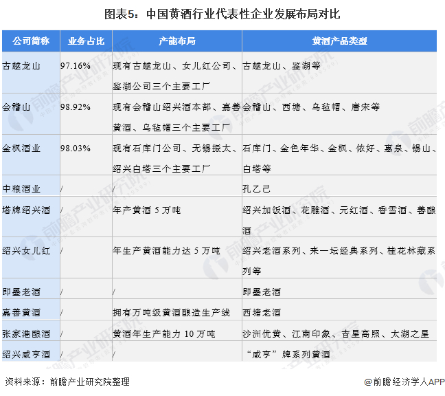 从我国黄酒行业代表性企业发展布局对比上看,古越龙山、会稽山、金枫酒业黄酒业务占比均较高,无论是产能布局还是黄酒品牌布局均较为完善,发展优势明显。