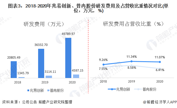 2020年,兆易创新研发费用为49787.97万元,占营收比重为11.07%;普冉股份研发费用为4597.15万元,占营收比重为6.41%。综合来看,普冉股份在研发费用规模、研发投入占比均低于兆易创新,主要系普冉股份成立时间较晚,目前正处于扩充研发团队力量、业务规模扩张阶段,相较于传统的行业龙头企业,在营业收入、研发费用等关键业务指标上仍有一定差距。
