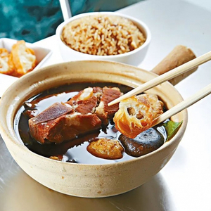 由于室内空间局促,我和陈先生总是在店外靠墙脚处摆张小桌椅。跑堂的Auntie见到老主顾,很麻利地搬来炭炉,坐上铝锅烧水。托盘里有把红泥茶壶,茶锈斑斑,还有纸包的铁观音老茶,有时是大红袍。滚水烫杯、泡茶,两人饮上几泡功夫茶,闲话静候。即使宾客盈门,上菜还是很快的,各要一碗肉骨,长长的排骨两条,关键是汤头滋味醇厚。老板曾透露说,里边放了一些中药材,当归、天麻等,以及各种香料如八角、茴香、桂皮、丁香等,而老锅用鸡鸭大棒骨吊汤,所以好味。我们通常还会再要碗猪肚或猪肝面线,两根油条,一碟黑酱油泡着碎红椒。排骨和油条都蘸着黑酱油吃,这才能吃出古早味来!
