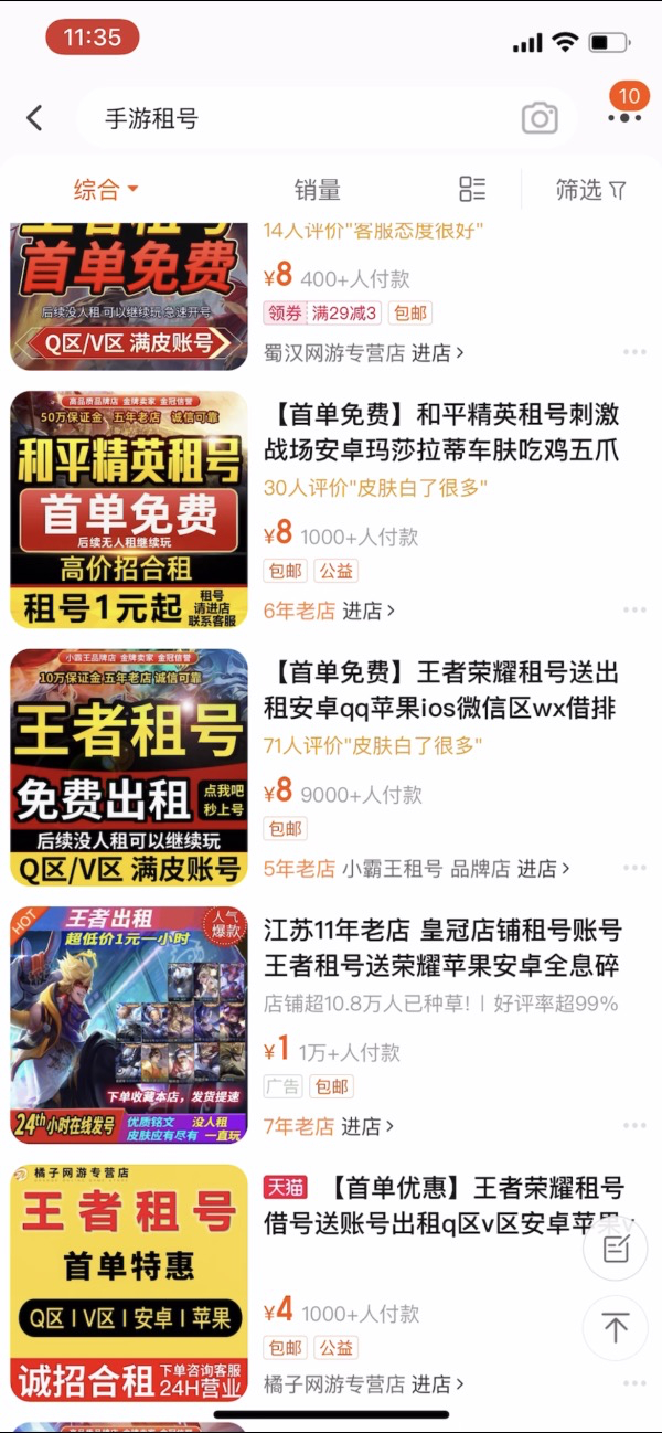 据江苏广电总台“我苏特稿”消息,在某购物平台,输入“手游租号”等关键词便可以轻松查找到大量的租号商家。租号时间往往以小时计价,在一些店铺,每小时的最低价格甚至不足1元。完全在未成年人的接受范围内。其中,单个链接月销超过5万单的商家不在少数。