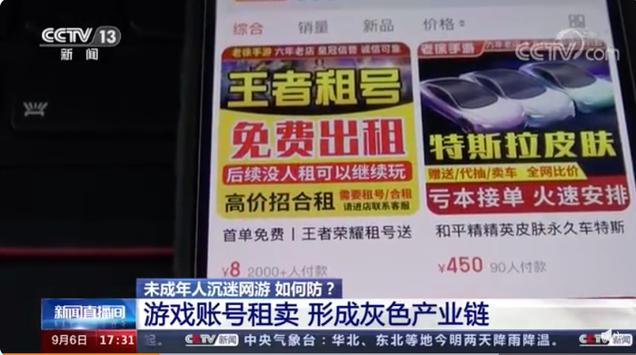 据央视新闻报道,网络上可以通过租号、买号等途径绕过监管无限制玩网游,游戏账号租卖已形成灰色产业链。