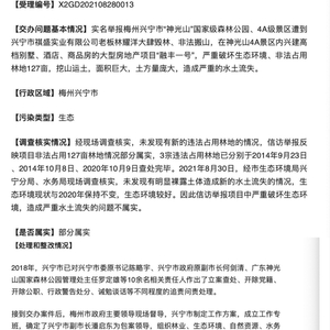 据广东梅州市广播电视台官方微信公众号“梅州新闻联播”消息,9月4日,中央第四生态环境保护督察组向梅州市交办第八批群众信访举报案件27宗(无重点案件)。其中一宗案件显示,梅州兴宁市的神光山国家级森林公园、4A级景区遭到毁林开发,未发现有新的违法占用林地的情况,信访举报反映项目非法占用127亩林地情况部分属实,3宗违法占用林地已分别于2014年9月23日、2014年10月8日、2020年10月9日查处完毕。2018年,兴宁市对兴宁市委原书记陈略宇等10余名相关责任人作出追责问责处理。