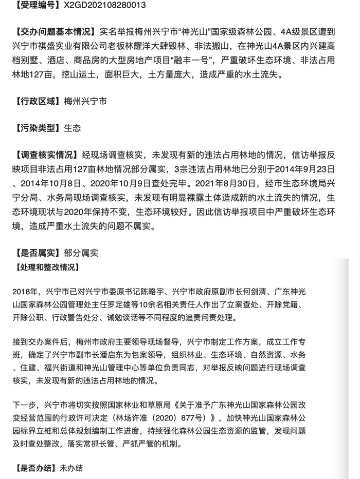 公开资料显示,神光山国家级森林公园位于梅州市兴宁市城郊,占地670余亩,是国家4A级景区。在中央第四生态环境保护督察组向梅州交办群众信访举报案件情况(第八批)中,神光山国家级森林公园被“点名”。中央第四生态环境保护督察组向梅州市交办的问题显示,该森林公园被实名举报称遭到兴宁市祺盛实业有限公司老板林耀洋大肆毁林、非法搬山,在神光山4A景区内兴建高档别墅、酒店、商品房的大型房地产项目“融丰一号”,严重破坏生态环境、非法占用林地127亩,挖山运土,面积巨大,土方量庞大,造成严重的水土流失。
