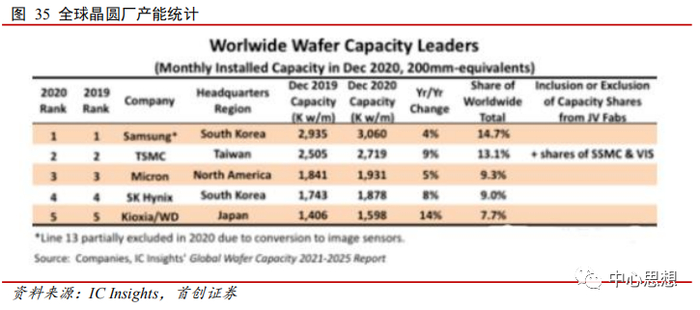 根据IC Insights的数据,2020年12月,三星、台积电、Micron、SK Hynix、Kioxia前五家公司的总产能占全球晶圆总产能的54%,比2019年的53%上升1个百分点。