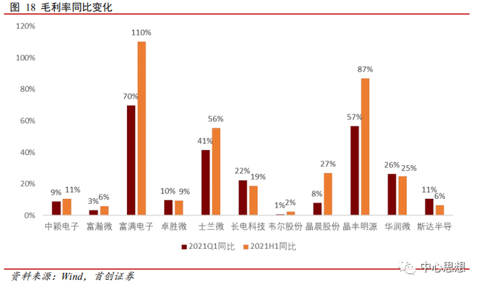 对于上半年毛利率变化不大的,有向下游传导涨价的空间的,台积电等代工企业涨价对此类芯片设计公司毛利率影响不大。
