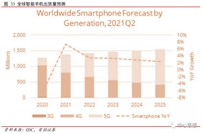 据IDC随后公布的数据显示,智能手机市场虽然增长速度也会下滑,但增长会一直持续到2023年。预计2021年,全球手机出货量将会增长7.4%,达到13.7亿台,2022年和2023年将分别增长3.4%。