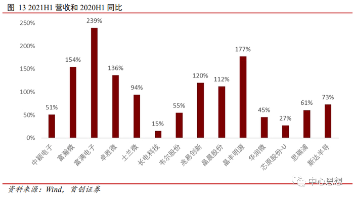 从主要半导体公司2021H1营收占2020年全年的比例来看,大部分公司2021H1收入占2020全年比重都在50%以上,富瀚微、富满电子的2021上半年收入已经超过了2020全年收入。
