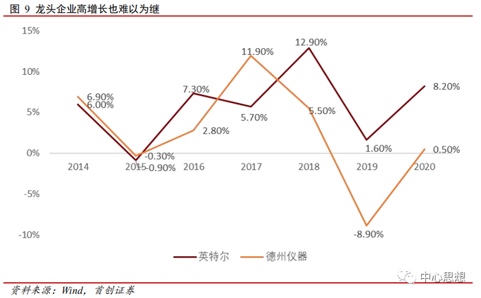 不仅是整个行业,其中龙头企业也面临着高增长难以为继的问题。英特尔5年营业总收入的复合增长率只有7.1%,模拟芯片龙头TI德州仪器过去5年的复合增长率也只有2.2%。