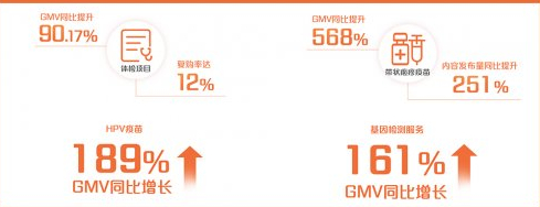 2021年上半年,高端体检产品GMV同比增长90.17%;守护女性健康的HPV疫苗,GMV同比增长189%;作为“爱老”必买选项的带状疱疹疫苗,GMV更是同比大增568%。并且,消费者的自我关怀已经由末到本,并推动了基因检测服务GMV同比增长161%。而对于事关“颜值”的口腔、头发,服务链条已经从“基础医疗”延伸至了“美容”,其中,口腔美容GMV同比增长368%。