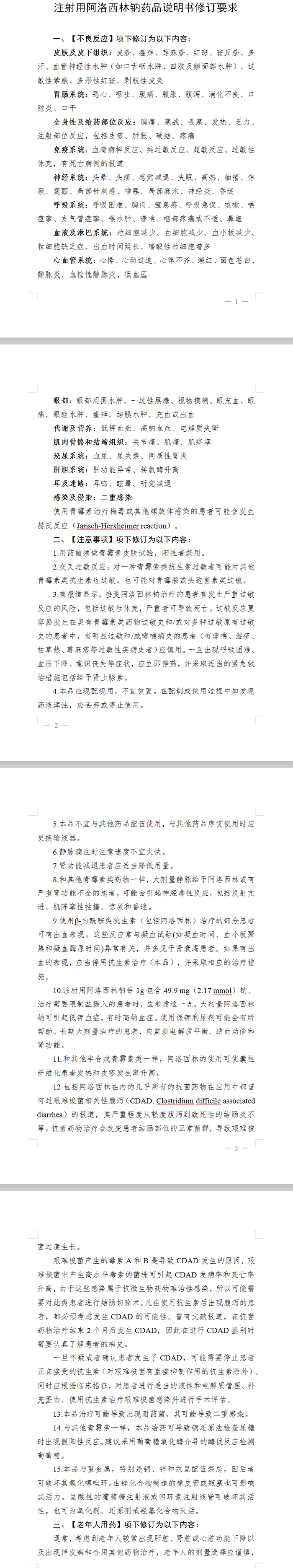 公告内容显示:注射用阿洛西林钠新增修订15项不良反应,另外还强调用药前须做青霉素皮肤试验,阳性者禁用。