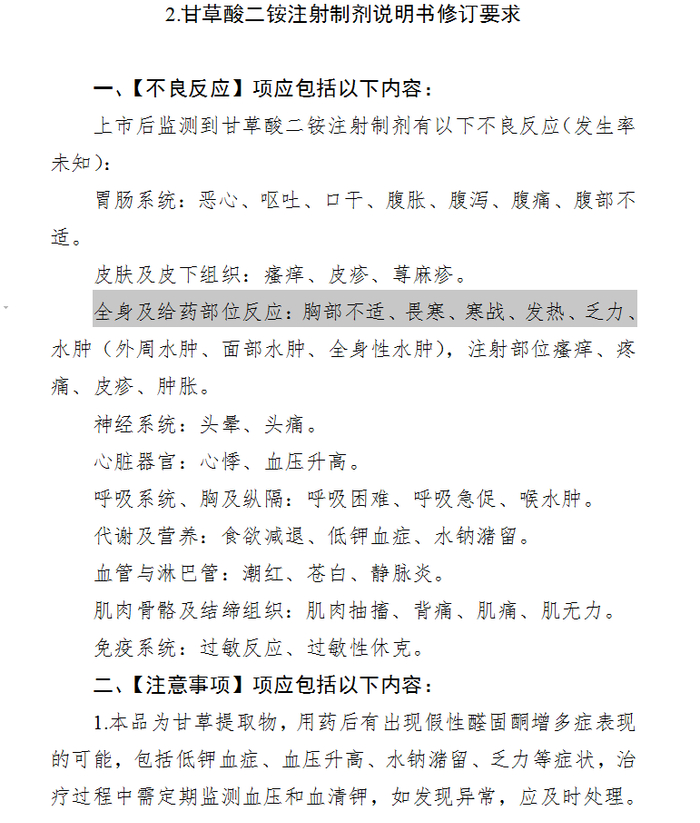 附件:甘草酸二铵口服制剂和甘草酸二铵注射制剂说明书修订要求