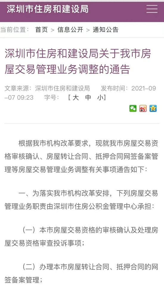 9月7日,深圳住建局发布《深圳市住房和建设局关于我市房屋交易管理业务调整的通告》。《通告》显示,根据深圳市机构改革安排,深圳市住房公积金管理中心正式承接房屋交易管理职能,并于9月13日正式施行,该中心将首批推出房屋交易资格审查、房屋买卖合同网签备案以及出具购房资格证明等业务“全程网办”。