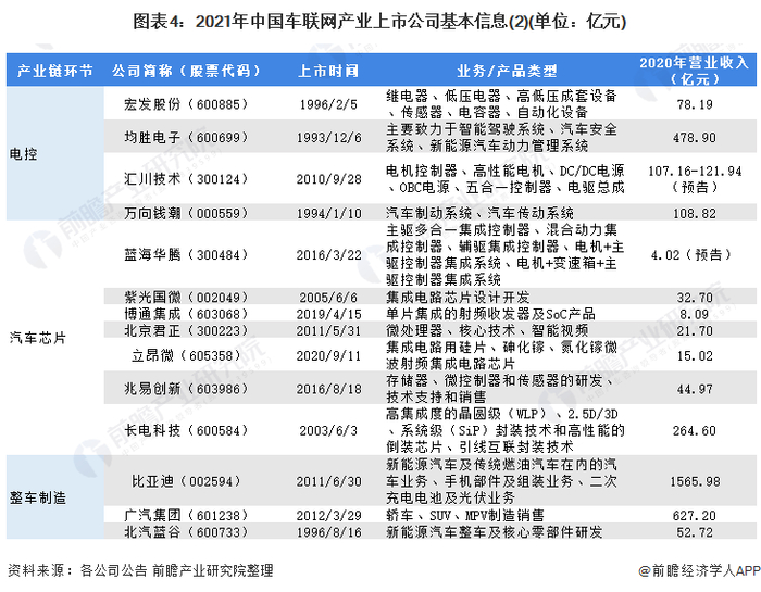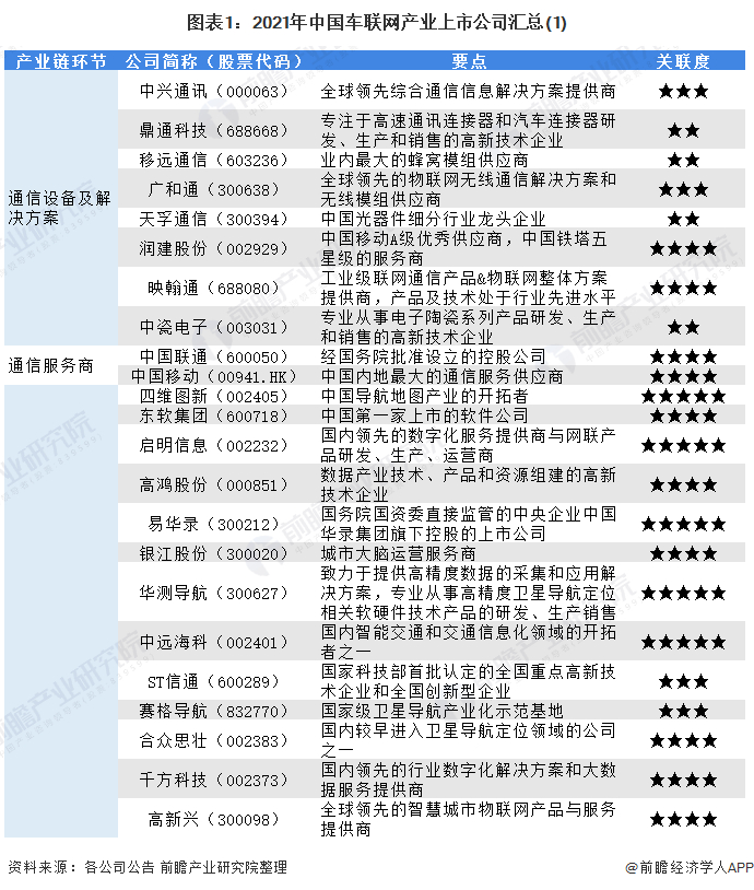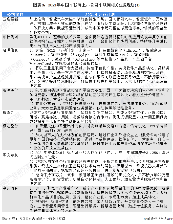 原标题:【最全】2021年中国车联网行业上市公司全方位对比(附业务布局汇总、业绩对比、业务规划等) 来源:前瞻产业研究院