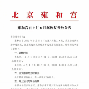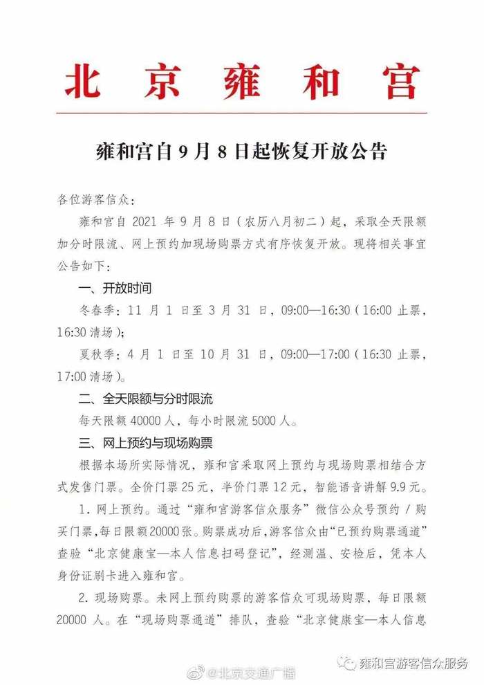 原标题:北京雍和宫自9月8日起恢复开放,每天限额40000人 来源:北京交通广播