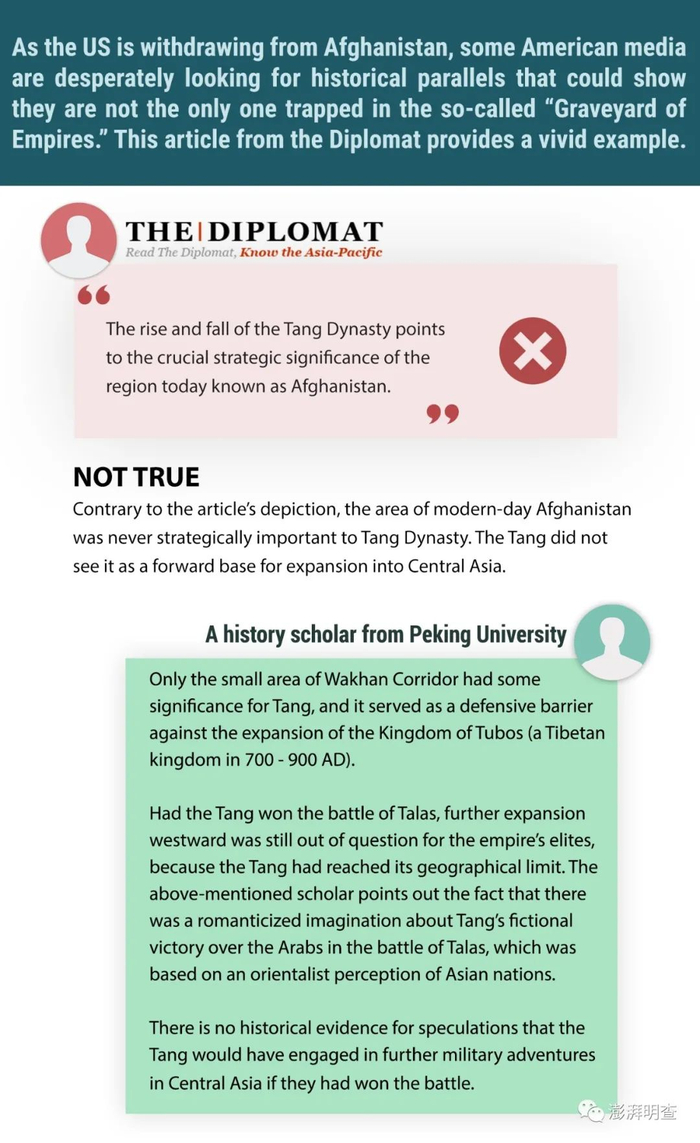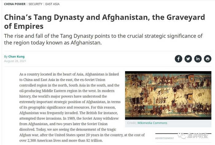 近日,美国撤军阿富汗及阿富汗局势未来发展引发全球关注。8月28日,《外交官》杂志(The Diplomat)发表了一篇文章,将美军撤出阿富汗与公元8世纪中国唐朝势力退出今日阿富汗地区进行类比,并暗示唐朝的国运与其能否控制阿富汗地区有着某种联系,“唐朝的兴衰表明今天被称为阿富汗的地区具有至关重要的战略意义”。