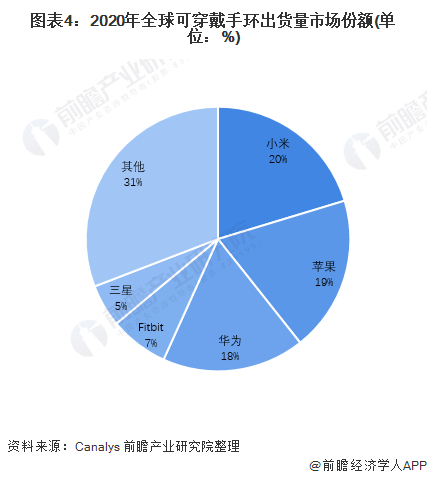 在可穿戴手环市场方面,2020年小米占据龙头地位,市场份额达20%。