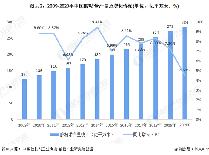 根据中国胶粘剂和胶粘带工业协会的统计数据,中国已成为世界最大胶带生产国,随着胶粘带行业规模不断扩大,在强大市场需求拉动作用下,未来中国胶粘带市场前景仍十分广阔。2019年中国胶黏带产量为272亿平方米,同比增长7.2%; 2020年我国胶粘带的产量约为284亿平方米。