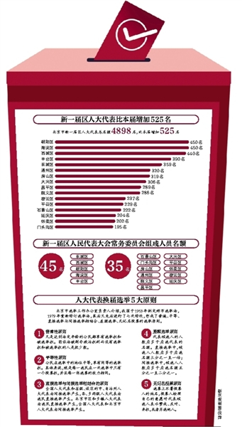 新京报讯 (记者吴为)北京市区和乡镇人大换届选举工作已全面展开,宣传发动和选民集中登记工作正在进行。此次换届选举涉及全市16个区、近180个乡镇,将选举产生近4900名区人大代表和一万余名乡镇人大代表,并召开新一届区和乡镇人民代表大会第一次会议,依法选举产生新一届区和乡镇国家机关领导人员。