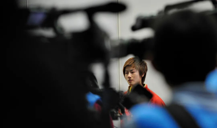 2010年5月30日,中国队球员丁宁在混合区等待。当日,在2010莫斯科世界乒乓球团体锦标赛女团决赛中,新加坡队以3比1战胜中国队,获得冠军。新华社记者陶希夷摄