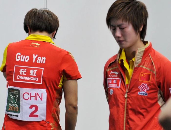 2010年5月30日,中国队球员郭焱和丁宁在混合区等待采访时落泪。当日,在2010莫斯科世界乒乓球团体锦标赛女团决赛中,新加坡队以3比1战胜中国队获得冠军。新华社记者陶希夷摄