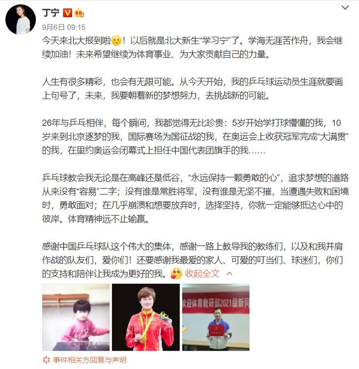 如此辉煌夺目的成绩在丁宁的退役声明中,却变成了寥寥几笔——