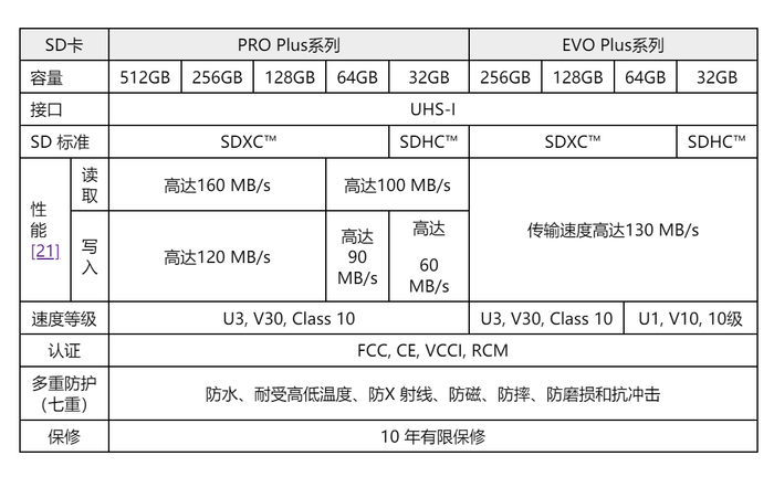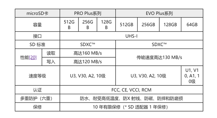 SD 卡的容量范围从 32GB 到 256GB,PRO Plus 系列新增了 512GB 选项。