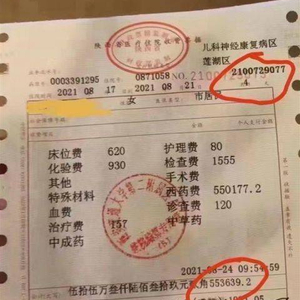 票据显示,患病女孩8月17日入院,21日出院,医院收取床位费620元,化验费930元,护理费80元,检查费1555元,诊查费120元,最贵的是西药费,高达550177.2元。票据同时显示,这次治疗医保统筹支付570.25元,医保报销0.26%,个人支付553068.95元。