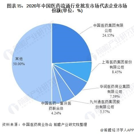 根据中国医药商业协会统计数据显示,在医药批发市场,2020年,我国医药批发市场仍以国药集团、上海医药、华润医药以及九州通四家为主,其中国药集团占比24.15%,处于绝对领先地位。