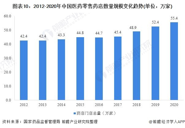 作为药品零售的主要参与者,我国药店数量规模自2012年以来保持持续增长态势,数据显示,截至到2019年底,我国药店门店数量首次突破50万家。2020年,全国药店门店数量进一步提升至55.4万家。