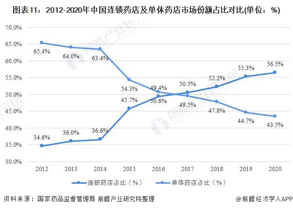 截至到2020年底,我国连锁药店总量为31.3万家,占药店总量的56.5%,而单体药店有24.1万家,占药店总量的24.1%。从目前行业发展趋势来看,单体药店市场份额在未来将被连锁药店进一步挤压。