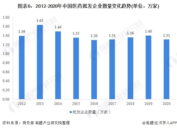 在医药批发环节,近年来,我国医药批发企业总量变化较为平稳,截至到2020年底,全国医药批发企业数量为1.31万家。