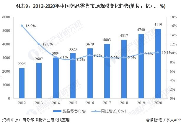 尽管市场参与者增速放缓,但面对我国日益增长的医药需求,我国药品零售市场规模仍保持平稳增长态势,2014-2020年,我国药品零售市场规模增速保持在9%-10%之间,到2020年,全国药品零售市场规模增长至5119亿元。