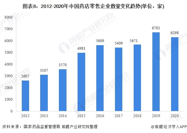近年来,随着行业集中度和药品零售连锁经营率进一步的提高,我国药品零售企业小、散等问题得到较为明显的改善。2015年以来,随着我国医药零售行业改革的深入,我国药店零售企业的数量规模的增长势头有所放缓,截至到2020年底,全国药店零售企业数量下滑至6298家,较上年同期减少近400家。