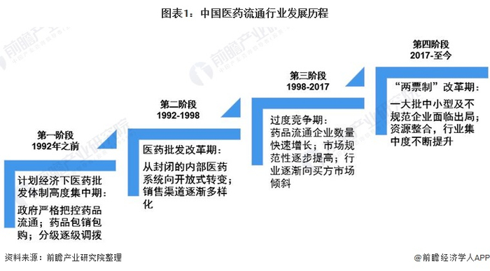 中国医药流通行业的发展受到中国经济体制变迁的影响,在不同的经济体制下呈现出不同的发展格局。中国的医药流通行业主要经历了以下几个阶段: