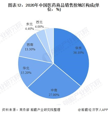 从各地区医药商品需求量来看,目前,我国医药商品需求集中在华东,华北以及中南等地,其中华东地区需求最大。2020年,全国六大区域销售额占全国销售总额的比重分别为:华东36.1%,中南27.0%,华北15.2%,西南13.3%,东北4.4%,西北4.0%。其中,华东、中南、华北三大区域销售额占到全国销售总额的78.3%,同比上升0.1个百分点。