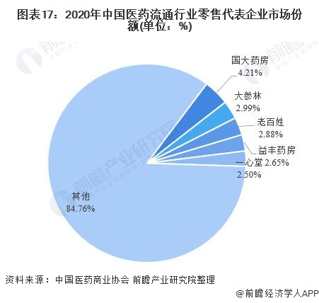目前,我国医药零售市场头部企业市场份额均处于较低水平,其中国大药房以4.21%的占比排第一,大参林、益丰药房等头部企业市场份额均在4%以下。