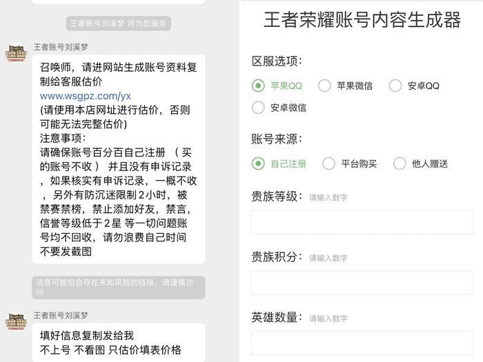 商品详情界面显示,此店铺保证自己销量第一,流量高,回报率高。询问客服发现,其售号流程同样也形成了较为完善的服务流水线。以王者荣耀账号为例,转接到专人客服后,客服随即发送店铺的估价网址,要求卖方先填写账号信息以进行估价。在此网站上,卖方需要填写自己账号的等级、皮肤数、英雄数、段位等等,稀有皮肤会单独列出供点击选择,提交后网址会生成一段信息,复制给客服即可收到估价。若选择继续交易,需要协助店铺换绑密保,随后才能进行打款。
