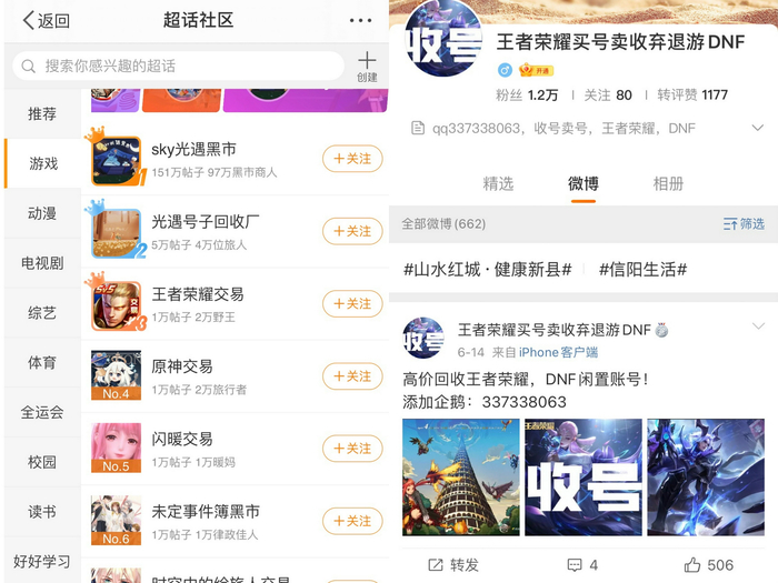 除了电商外,更多的租号卖号交易发生在社交平台。在微博,各个热门游戏都有专门的游戏交易超话,活跃着众多个人买方和卖方,除此外,更有专门进行买号收号的账号,引导加qq进行交易。因此,即便是打击电商与交易平台,游戏账号租售现象也并不能完全禁止。