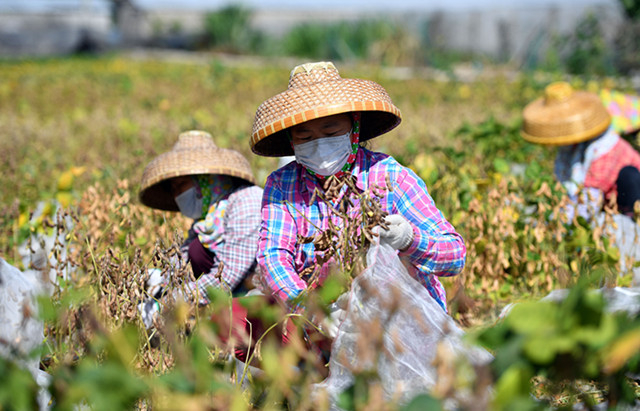 工人在采收中国农业科学院油料作物研究所在三亚繁育的大豆(2020年2月27日)。新华社