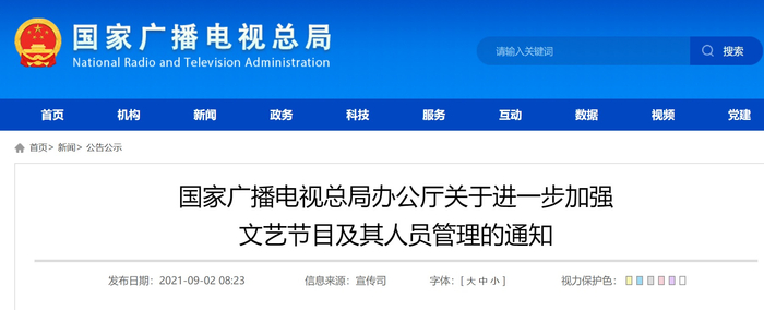 9月2日,国家广播电视总局发布通知称,近年来,广播电视和网络视听文艺节目坚持讲品位讲格调讲责任、抵制低俗庸俗媚俗,不断推出优秀作品,满足人民群众精神文化需要。为进一步加强管理,从严整治艺人违法失德、“饭圈”乱象等问题,旗帜鲜明树立爱党爱国、崇德尚艺的行业风气,现就有关事项通知如下: