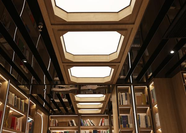 天花板上镶嵌着一盏盏八边形的灯,设计理念是“读万卷书,知八方事。”
