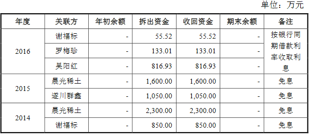 2014年,腾远钴业向晨光稀土、谢福标分别拆出资金2300.00万元和850.00万元,并于同年收回资金,均为免息。其中,晨光稀土系曾受腾远钴业实际控制人之一的罗洁配偶黄平控制的公司。