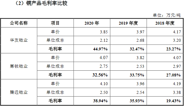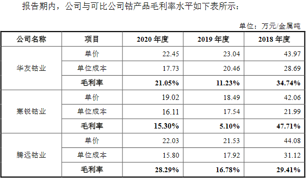 2018年至2020年,同行业可比公司华友钴业毛利率分别为28.56%、10.68%和14.75%,寒锐钴业毛利率分比为45.33%、11.77%和23.84%。也就是说,2019年和2020年,腾远钴业的毛利率均远高于同行龙头公司华友钴业和寒锐钴业。