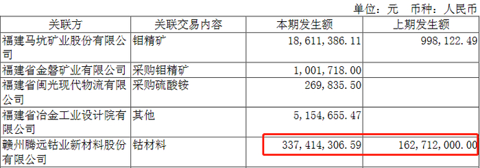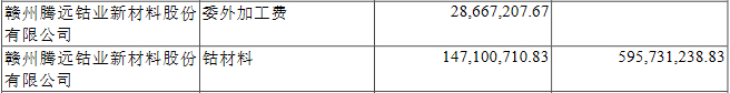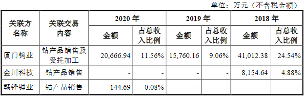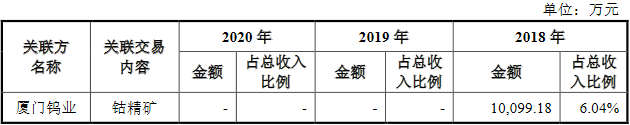此外,2018年,腾远钴业与厦门钨业还存在偶发性关联销售,金额为1.01亿元,占总收入比例为6.04%。