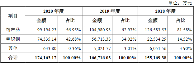 2018年至2020年,腾远钴业钴产品实现营业收入分别为12.66亿元、10.50亿元和9.92亿元,占该公司主营业务收入的比例分别为81.58%、62.97%和56.95%。