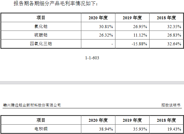 按细分产品来看,2018年至2020年,腾远钴业氯化钴毛利率分别为32.35%、26.95%和30.81%,硫酸钴毛利率分别为26.83%、11.12%和26.32%,四氧化三钴毛利率分别为32.64%、-15.88%、不适用,电积铜毛利率分别为19.43%、35.93%和38.94%。