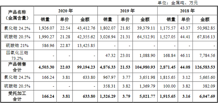 2019年、2020年钴产品平均销售价格较2018年“腰斩”