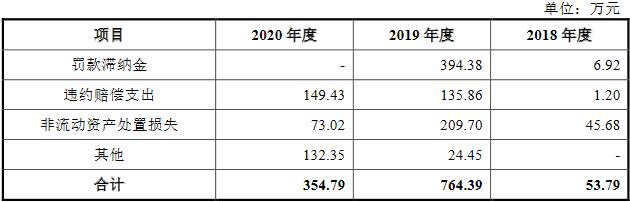 另据招股说明书,2017年至2020年,腾远钴业营业外支出分别为203.65万元、53.79万元、764.39万元和354.79万元,主要为固定资产处置损失、罚款滞纳金及违约赔偿支出。
