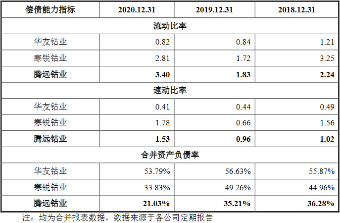 2014年至2020年,合并资产负债率上,华友钴业分别为71.06%、74.80%、58.77%、63.43%、55.87%、56.63%、53.79%,寒锐钴业分别为67.85%、63.70%、53.49%、48.76%、44.96%、49.26%和33.83%;流动比率上,华友钴业分别为0.86、0.81、1.00、1.09、1.21、0.84和0.82,寒锐钴业分别为1.14、1.19、1.36、2.08、3.25、1.72和2.81;速动比率上,华友钴业分别为0.37、0.40、0.64、0.54、0.49、0.44和0.41,寒锐钴业分别为0.52、0.49、0.61、1.04、1.56、0.66和1.78。